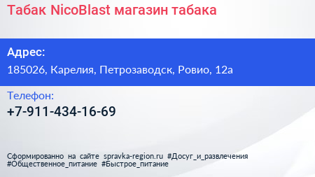 Табак NicoBlast, магазин табака по адресу 185026, Карелия, Петрозаводск, Ровио, 12а в дальнейшем Организация, размещена в следующих категориях: