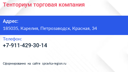 Тенториум, торговая компания по адресу 185035, Карелия, Петрозаводск, Красная, 34 в дальнейшем Организация, размещена в следующих категориях: