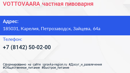 VOTTOVAARA, частная пивоварня по адресу 185031, Карелия, Петрозаводск, Зайцева, 64а в дальнейшем Организация, размещена в следующих категориях: