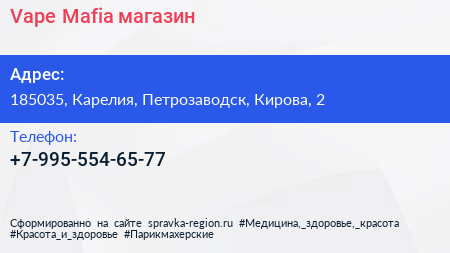 Vape Mafia, магазин по адресу 185035, Карелия, Петрозаводск, Кирова, 2 в дальнейшем Организация, размещена в следующих категориях: