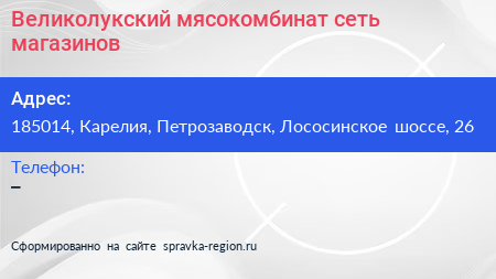 Великолукский мясокомбинат, сеть магазинов по адресу 185014, Карелия, Петрозаводск, Лососинское шоссе, 26 в дальнейшем Организация, размещена в следующих категориях:
