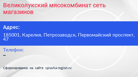 Великолукский мясокомбинат, сеть магазинов по адресу 185001, Карелия, Петрозаводск, Первомайский проспект, 47 в дальнейшем Организация, размещена в следующих категориях: