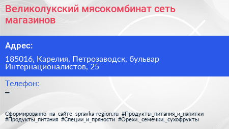 Великолукский мясокомбинат, сеть магазинов по адресу 185016, Карелия, Петрозаводск, бульвар Интернационалистов, 25 в дальнейшем Организация, размещена в следующих категориях: