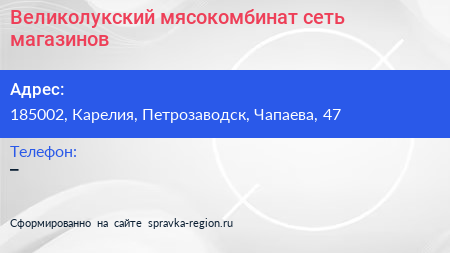 Великолукский мясокомбинат, сеть магазинов по адресу 185002, Карелия, Петрозаводск, Чапаева, 47 в дальнейшем Организация, размещена в следующих категориях: