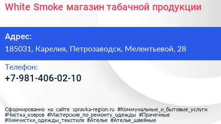 White Smoke, магазин табачной продукции по адресу 185031, Карелия, Петрозаводск, Мелентьевой, 28 в дальнейшем Организация, размещена в следующих категориях: