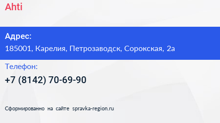 Ahti по адресу 185001, Карелия, Петрозаводск, Сорокская, 2а в дальнейшем Организация, размещена в следующих категориях:
