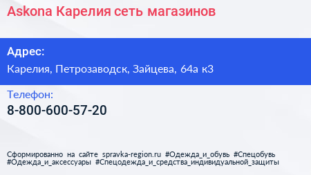 Askona Карелия, сеть магазинов по адресу Карелия, Петрозаводск, Зайцева, 64а к3 в дальнейшем Организация, размещена в следующих категориях: