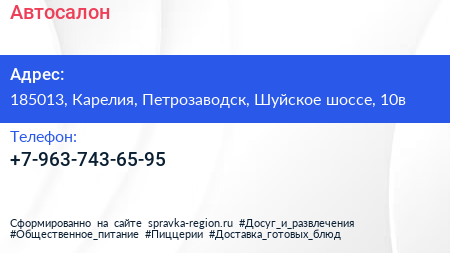 Автосалон по адресу 185013, Карелия, Петрозаводск, Шуйское шоссе, 10в в дальнейшем Организация, размещена в следующих категориях: