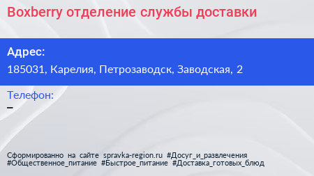 Boxberry, отделение службы доставки по адресу 185031, Карелия, Петрозаводск, Заводская, 2 в дальнейшем Организация, размещена в следующих категориях: