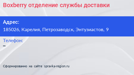 Boxberry, отделение службы доставки по адресу 185026, Карелия, Петрозаводск, Энтузиастов, 9 в дальнейшем Организация, размещена в следующих категориях: