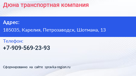 Дюна, транспортная компания по адресу 185035, Карелия, Петрозаводск, Шотмана, 13 в дальнейшем Организация, размещена в следующих категориях: