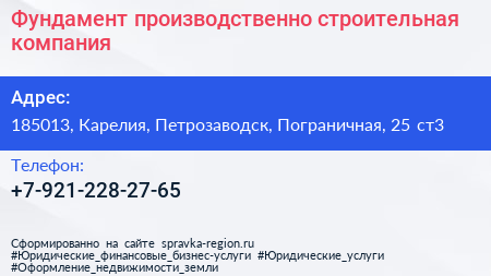 Фундамент, производственно-строительная компания по адресу 185013, Карелия, Петрозаводск, Пограничная, 25 ст3 в дальнейшем Организация, размещена в следующих категориях: