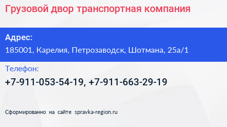 Грузовой двор, транспортная компания по адресу 185001, Карелия, Петрозаводск, Шотмана, 25а/1 в дальнейшем Организация, размещена в следующих категориях: