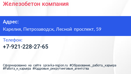 Железобетон, компания по адресу Карелия, Петрозаводск, Лесной проспект, 59 в дальнейшем Организация, размещена в следующих категориях: