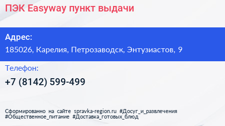 ПЭК: Easyway, пункт выдачи по адресу 185026, Карелия, Петрозаводск, Энтузиастов, 9 в дальнейшем Организация, размещена в следующих категориях: