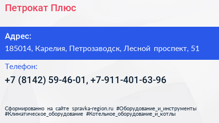Петрокат Плюс по адресу 185014, Карелия, Петрозаводск, Лесной проспект, 51 в дальнейшем Организация, размещена в следующих категориях:
