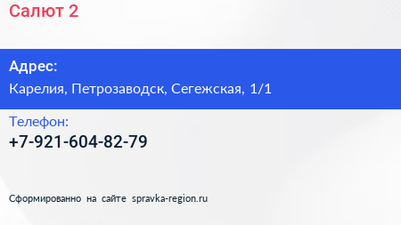 Салют-2 по адресу Карелия, Петрозаводск, Сегежская, 1/1 в дальнейшем Организация, размещена в следующих категориях: