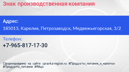 Знак, производственная компания по адресу 185013, Карелия, Петрозаводск, Медвежьегорская, 3/2 в дальнейшем Организация, размещена в следующих категориях: