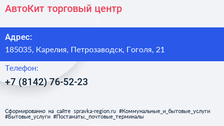 АвтоКит, торговый центр по адресу 185035, Карелия, Петрозаводск, Гоголя, 21 в дальнейшем Организация, размещена в следующих категориях: