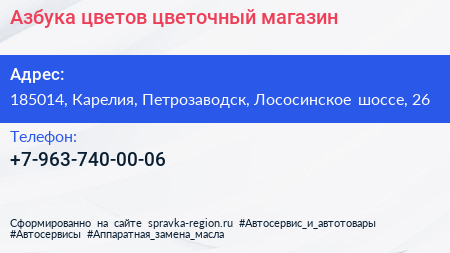 Азбука цветов, цветочный магазин по адресу 185014, Карелия, Петрозаводск, Лососинское шоссе, 26 в дальнейшем Организация, размещена в следующих категориях: