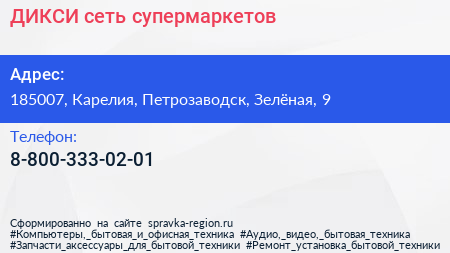 ДИКСИ, сеть супермаркетов по адресу 185007, Карелия, Петрозаводск, Зелёная, 9 в дальнейшем Организация, размещена в следующих категориях: