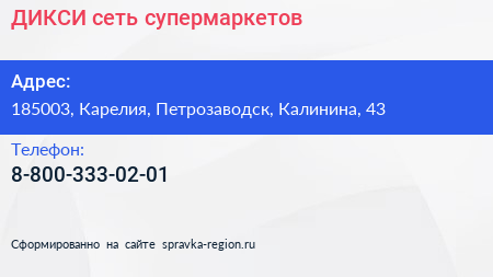 ДИКСИ, сеть супермаркетов по адресу 185003, Карелия, Петрозаводск, Калинина, 43 в дальнейшем Организация, размещена в следующих категориях: