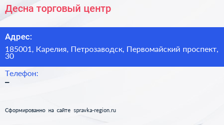 Десна, торговый центр по адресу 185001, Карелия, Петрозаводск, Первомайский проспект, 30 в дальнейшем Организация, размещена в следующих категориях: