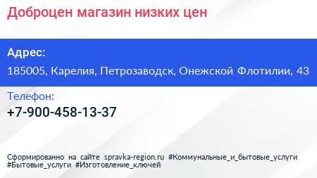 Доброцен, магазин низких цен по адресу 185005, Карелия, Петрозаводск, Онежской Флотилии, 43 в дальнейшем Организация, размещена в следующих категориях: