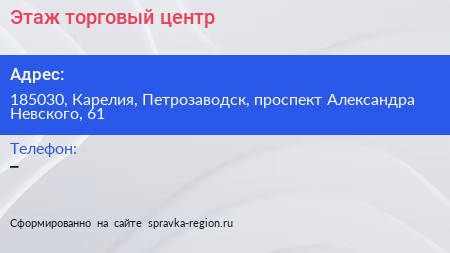 Этаж, торговый центр по адресу 185030, Карелия, Петрозаводск, проспект Александра Невского, 61 в дальнейшем Организация, размещена в следующих категориях: