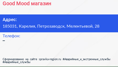 Good Mood, магазин по адресу 185031, Карелия, Петрозаводск, Мелентьевой, 28 в дальнейшем Организация, размещена в следующих категориях: