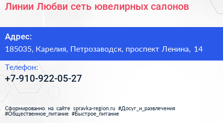 Линии Любви, сеть ювелирных салонов по адресу 185035, Карелия, Петрозаводск, проспект Ленина, 14 в дальнейшем Организация, размещена в следующих категориях: