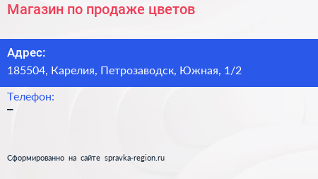 Магазин по продаже цветов по адресу 185504, Карелия, Петрозаводск, Южная, 1/2 в дальнейшем Организация, размещена в следующих категориях: