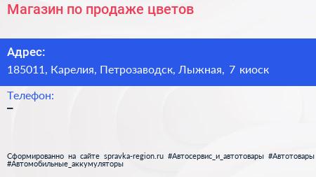 Магазин по продаже цветов по адресу 185011, Карелия, Петрозаводск, Лыжная, 7 киоск в дальнейшем Организация, размещена в следующих категориях: