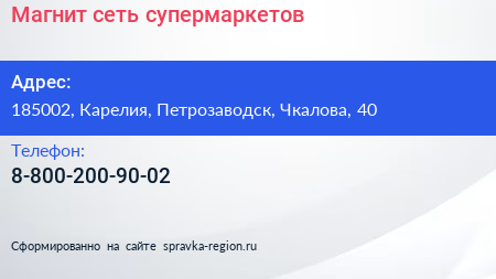Магнит, сеть супермаркетов по адресу 185002, Карелия, Петрозаводск, Чкалова, 40 в дальнейшем Организация, размещена в следующих категориях: