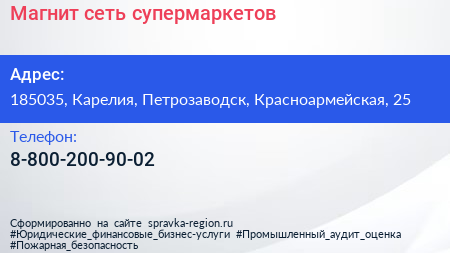 Магнит, сеть супермаркетов по адресу 185035, Карелия, Петрозаводск, Красноармейская, 25 в дальнейшем Организация, размещена в следующих категориях: