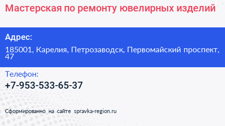 Мастерская по ремонту ювелирных изделий по адресу 185001, Карелия, Петрозаводск, Первомайский проспект, 47 в дальнейшем Организация, размещена в следующих категориях: