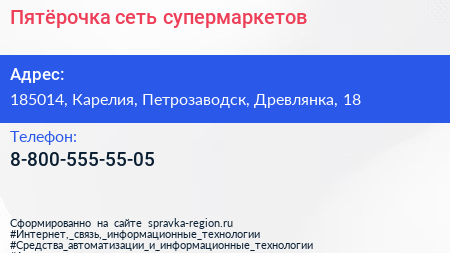 Пятёрочка, сеть супермаркетов по адресу 185014, Карелия, Петрозаводск, Древлянка, 18 в дальнейшем Организация, размещена в следующих категориях: