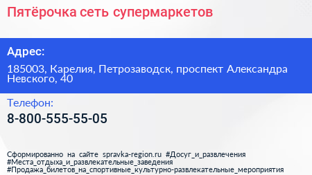 Пятёрочка, сеть супермаркетов по адресу 185003, Карелия, Петрозаводск, проспект Александра Невского, 40 в дальнейшем Организация, размещена в следующих категориях: