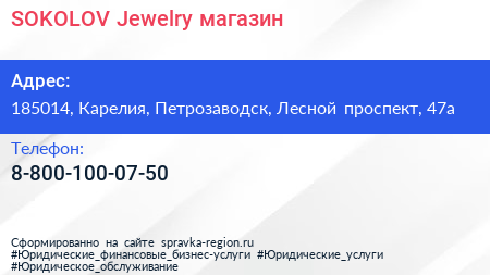 SOKOLOV Jewelry, магазин по адресу 185014, Карелия, Петрозаводск, Лесной проспект, 47а в дальнейшем Организация, размещена в следующих категориях: