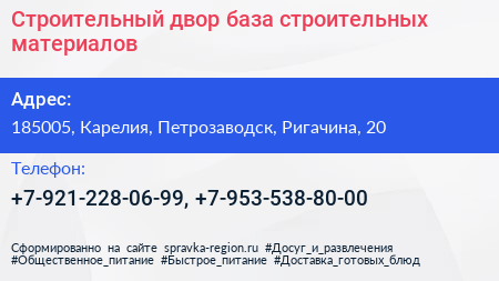 Строительный двор, база строительных материалов по адресу 185005, Карелия, Петрозаводск, Ригачина, 20 в дальнейшем Организация, размещена в следующих категориях: