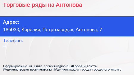 Торговые ряды на Антонова по адресу 185033, Карелия, Петрозаводск, Антонова, 7 в дальнейшем Организация, размещена в следующих категориях: