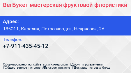 ВегБукет, мастерская фруктовой флористики по адресу 185011, Карелия, Петрозаводск, Некрасова, 26 в дальнейшем Организация, размещена в следующих категориях: