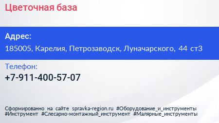 Цветочная база по адресу 185005, Карелия, Петрозаводск, Луначарского, 44 ст3 в дальнейшем Организация, размещена в следующих категориях: