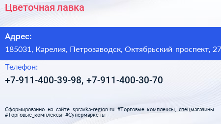 Цветочная лавка по адресу 185031, Карелия, Петрозаводск, Октябрьский проспект, 27 в дальнейшем Организация, размещена в следующих категориях: