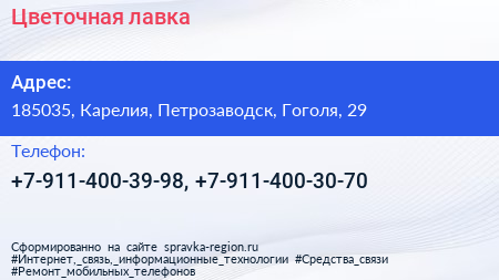 Цветочная лавка по адресу 185035, Карелия, Петрозаводск, Гоголя, 29 в дальнейшем Организация, размещена в следующих категориях: