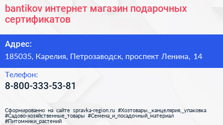 bantikov, интернет-магазин подарочных сертификатов по адресу 185035, Карелия, Петрозаводск, проспект Ленина, 14 в дальнейшем Организация, размещена в следующих категориях: