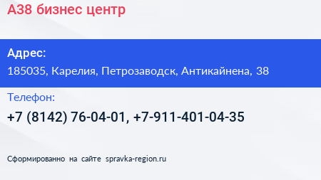 А38, бизнес-центр по адресу 185035, Карелия, Петрозаводск, Антикайнена, 38 в дальнейшем Организация, размещена в следующих категориях: