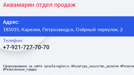 Аквамарин, отдел продаж по адресу 185035, Карелия, Петрозаводск, Озёрный переулок, 2 в дальнейшем Организация, размещена в следующих категориях: