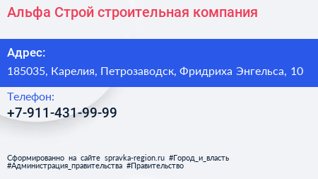 Альфа-Строй, строительная компания по адресу 185035, Карелия, Петрозаводск, Фридриха Энгельса, 10 в дальнейшем Организация, размещена в следующих категориях: