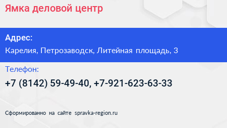 Ямка, деловой центр по адресу Карелия, Петрозаводск, Литейная площадь, 3 в дальнейшем Организация, размещена в следующих категориях: